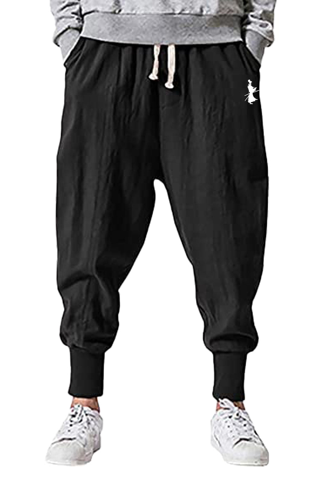 Pants de corte grabdown en tela de mezcla de algodón elástico de alta calidad. Cintura con elástico, bolsillos laterales, tobillo de elástico alto con dobladillo acanalado estrecho.