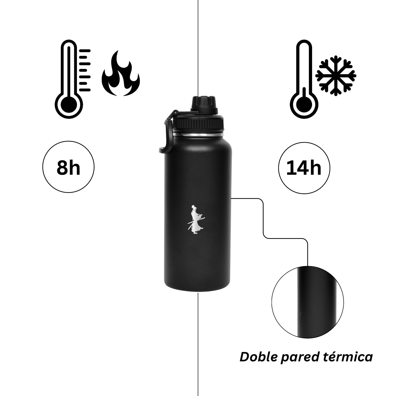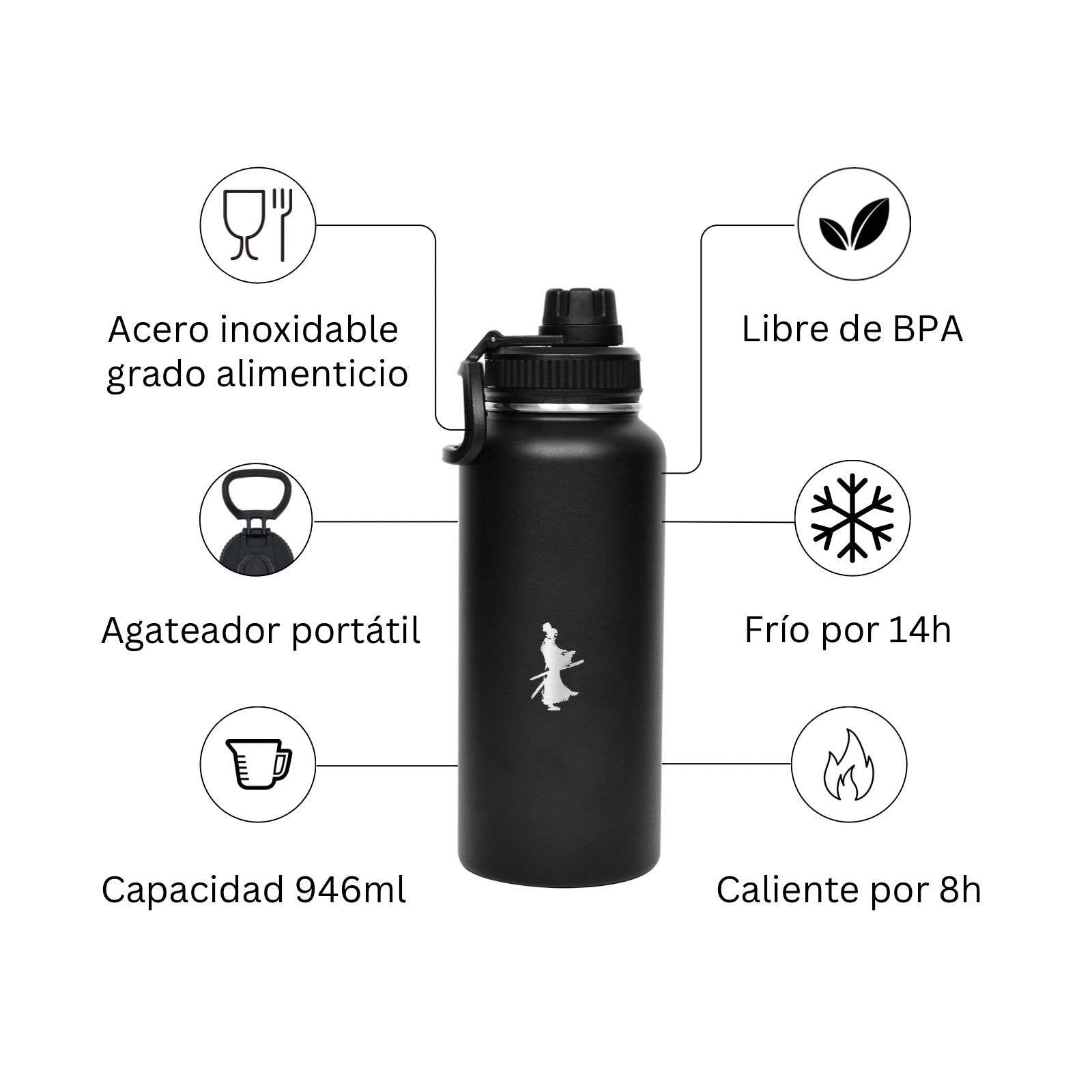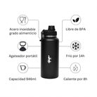 Termo  negro de acero inoxidable con una capacidad de 946 ml. Duradero y resiste la posibilidad de abolladuras